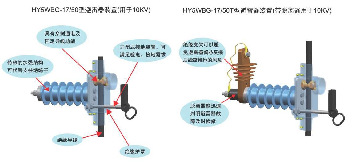 HY5WDG-17/50型氧化锌避雷器装置具有带支柱功能、避雷器功能、母排接线功能、验电接地功能的合四者功能为一体。由河间市天恒电力器材有限公司研究开发,采用这种装置同时可减少一根避雷器横担(因利用了本来需要的支柱横担),可减少下垂线固定用的三个绝缘子,也就是减少七处剥皮点,减少施工工时,同时减少六处故障点,则能达到简化线路装置,进一步增加运行安全可靠性的目的,使线路更加简洁美观。这种装置集成了多种功能,把原需要七处剥皮点的绝缘并在一处绝缘,并且此绝缘罩设计合理,能真正做到全程绝缘,为安全和带电作业创造了有利条件。