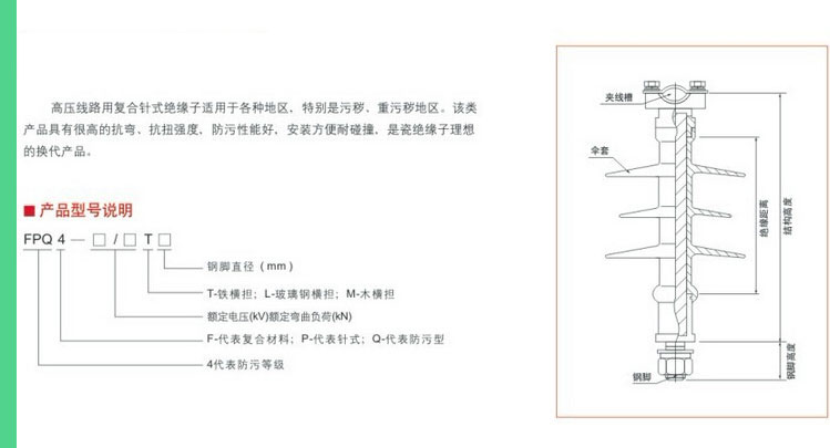 FPQ-10/5T20复合针式绝缘子复合针式绝缘子具有很高的抗弯曲,抗冲击性、抗震性和防爆性能优越。内绝缘可靠、重量轻,是传统电瓷的理想换代产品。