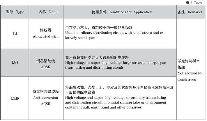 铝绞线及钢芯绞线的型号、名称及使用条件如表1