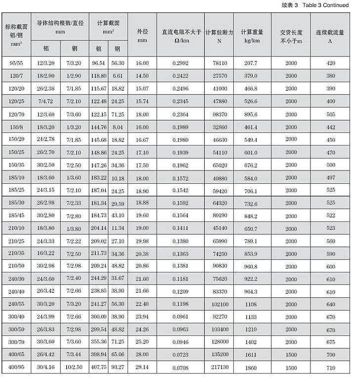 注 Note: LGJF型的计算重量,应在上表内规定值中增加防腐涂料的重量。其增值为:钢芯涂防腐涂料者增加2%,内部铝钢各层间涂防腐涂料者增加5%。