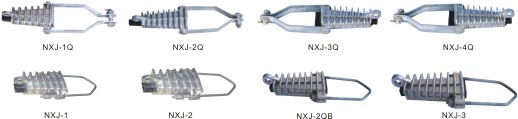 NXJ系列适用于20kV及以下架空绝缘铝芯线 (JKLYJ)的终端或耐张段两端的绝缘子串上,将架 空绝缘导线固定和拉紧。产品分两种形式,每种形式的产品按导线规格分配有不同的塑料楔芯。
