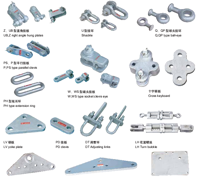 主要有:联板,调整环,十字挂板,花兰螺丝,球头挂环,碗头挂板,U形挂环,平行挂板,挂板。直角挂环,加强形U形挂环,拉环,U型螺丝,支撑架。